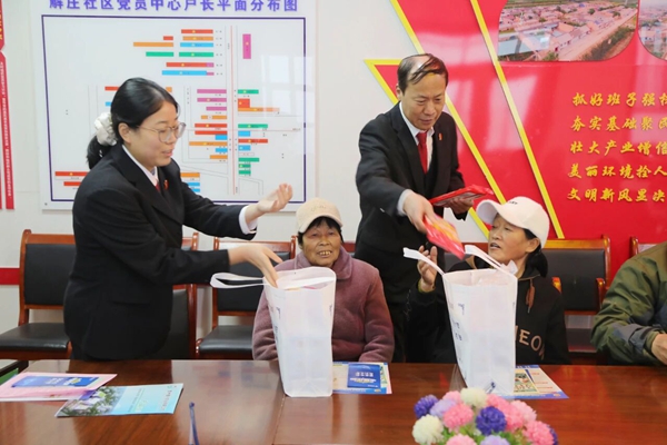 在互动咨询环节,干警们对遗嘱订立、继承纠纷、邻里矛盾等问题逐一耐心解答,用通俗易懂的语言将法律条文转化为“生活指南”,引导老年人树立“遇事找法、用法维权”的意识。活动中,干警还为老年人送上印有平安创建标语的手提袋、毛巾、餐巾纸等实用物品,让平安理念融入日常生活,传递司法温度。