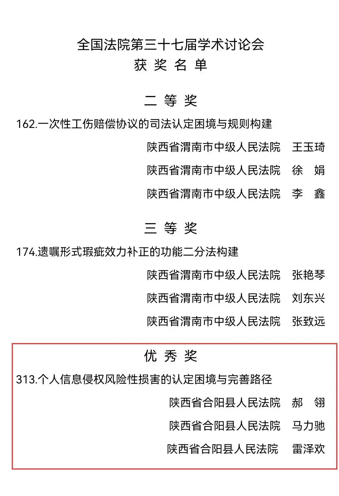 全国法院第三十七届学术讨论会论文评选 优秀奖