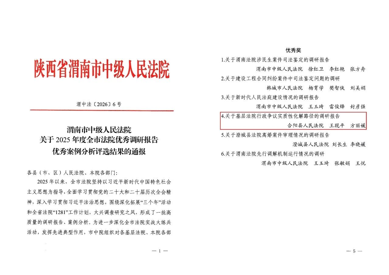 2026 年新年伊始,合阳法院佳讯频传,在调查研究、国家赔偿审判和司法救助工作等领域斩获多项荣誉,为新的一年奏响激昂序曲。