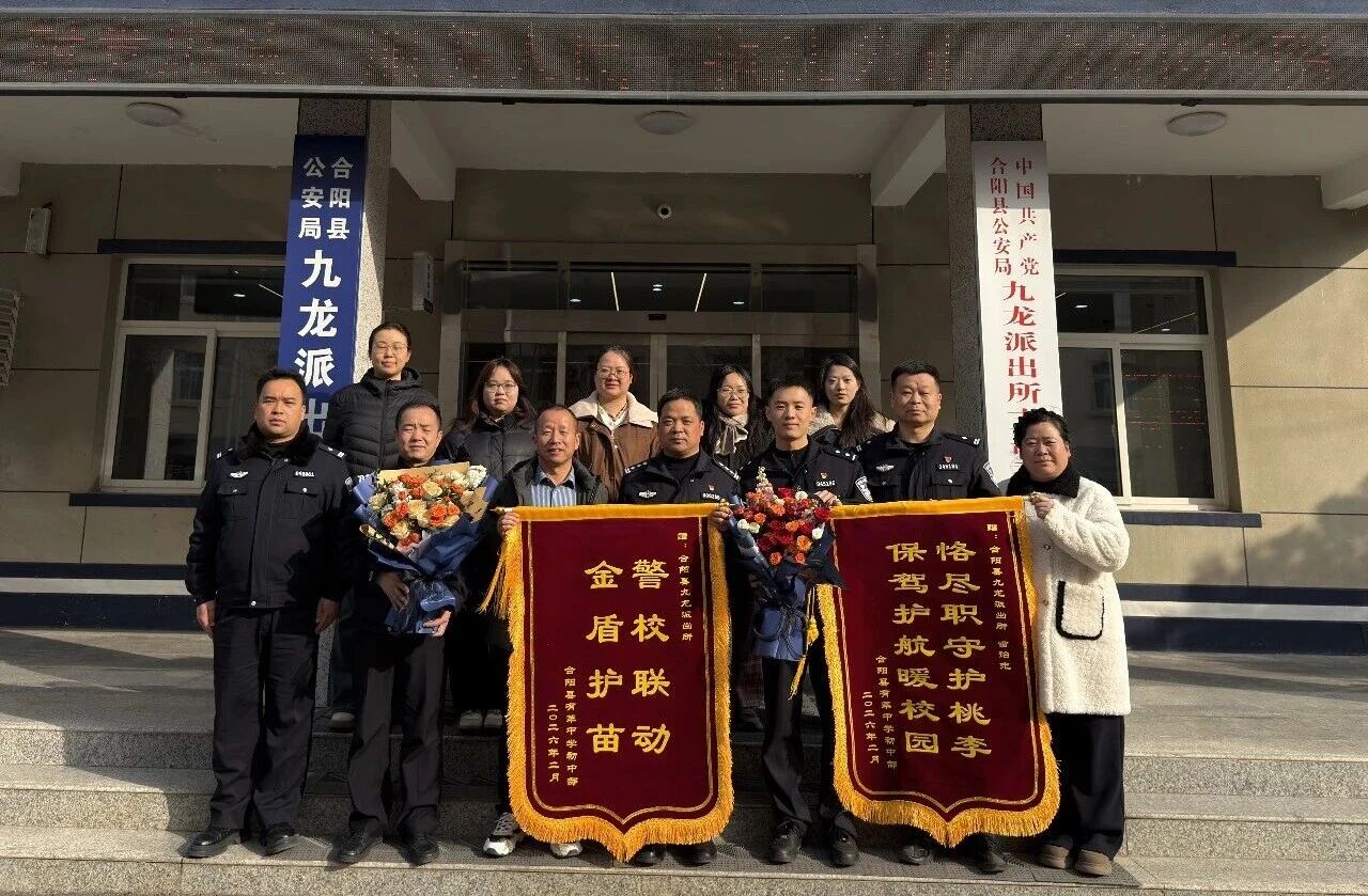 2月6日,有莘中学初中部校长及安全负责副校长带领多名教师代表,捧着两面写有“恪尽职守护桃李 保驾护航暖校园”“警校联动 金盾护苗”的锦旗和两束鲜花,专程来到合阳县公安局九龙派出所,向长期坚守在“护苗”一线的民辅警表达诚挚谢意。这温暖的一幕,正是派出所深耕“金盾护苗”行动、筑牢校园安全防线的生动写照。