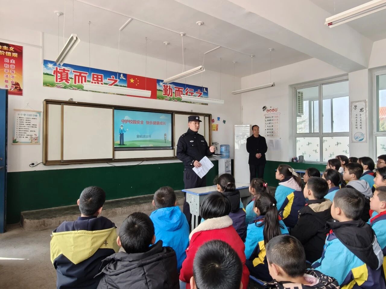 开学第一天,金峪派出所民警走进校园,开展 “开学第一课” 法治安全教育活动,为同学们送上实用的安全 “锦囊”。民警结合真实典型案例,用通俗易懂的语言,围绕防校园欺凌、交通安全、消防安全、防范电信诈骗等内容细致讲解,教育学生遵守校规校纪、远离危险行为,遭遇欺凌及时向老师、家长和警察求助;上下学严守交通规则,不乘坐违规车辆;掌握基础消防逃生技能,提高反诈警惕,做到不轻信、不透露、不转账。