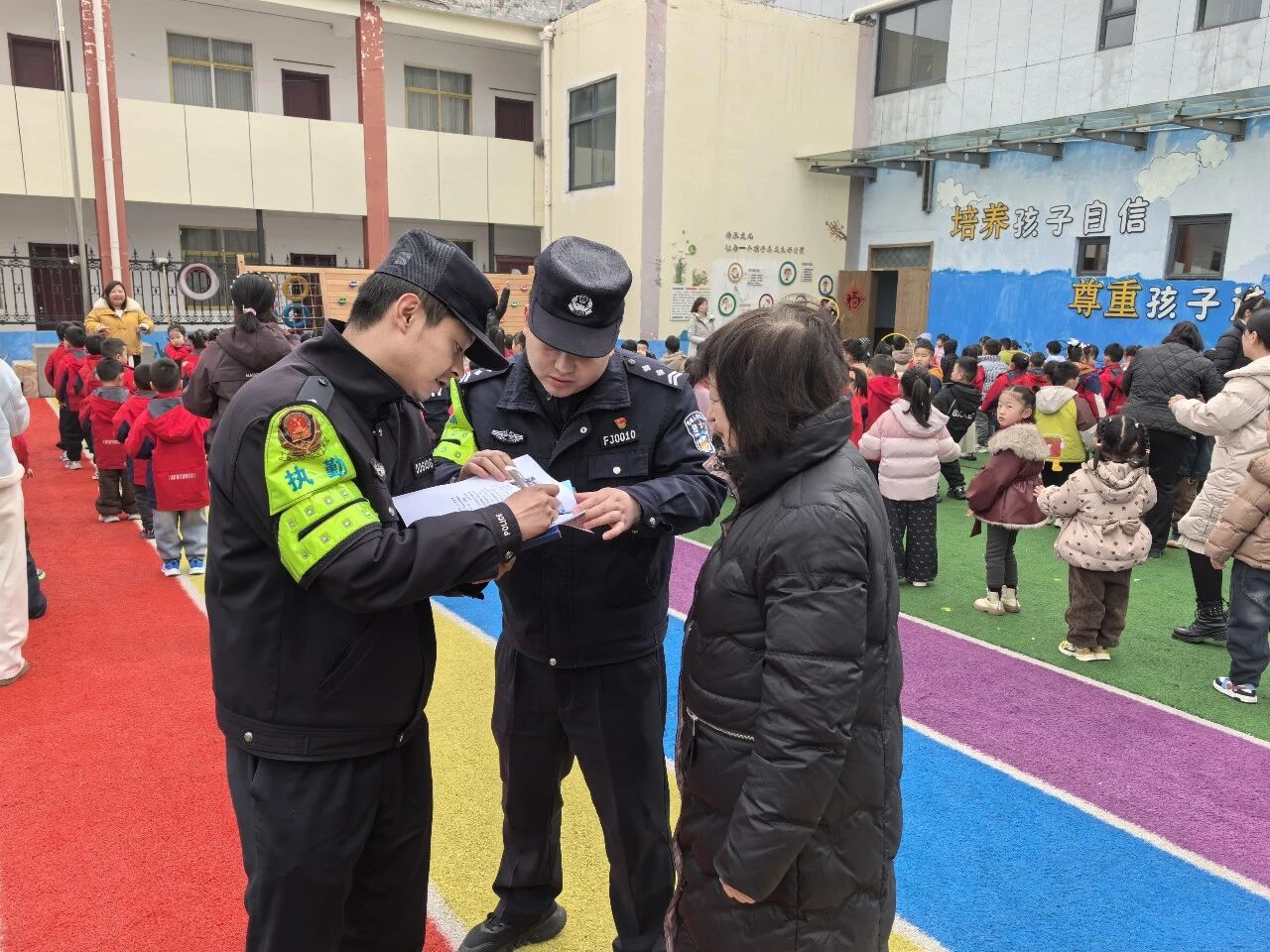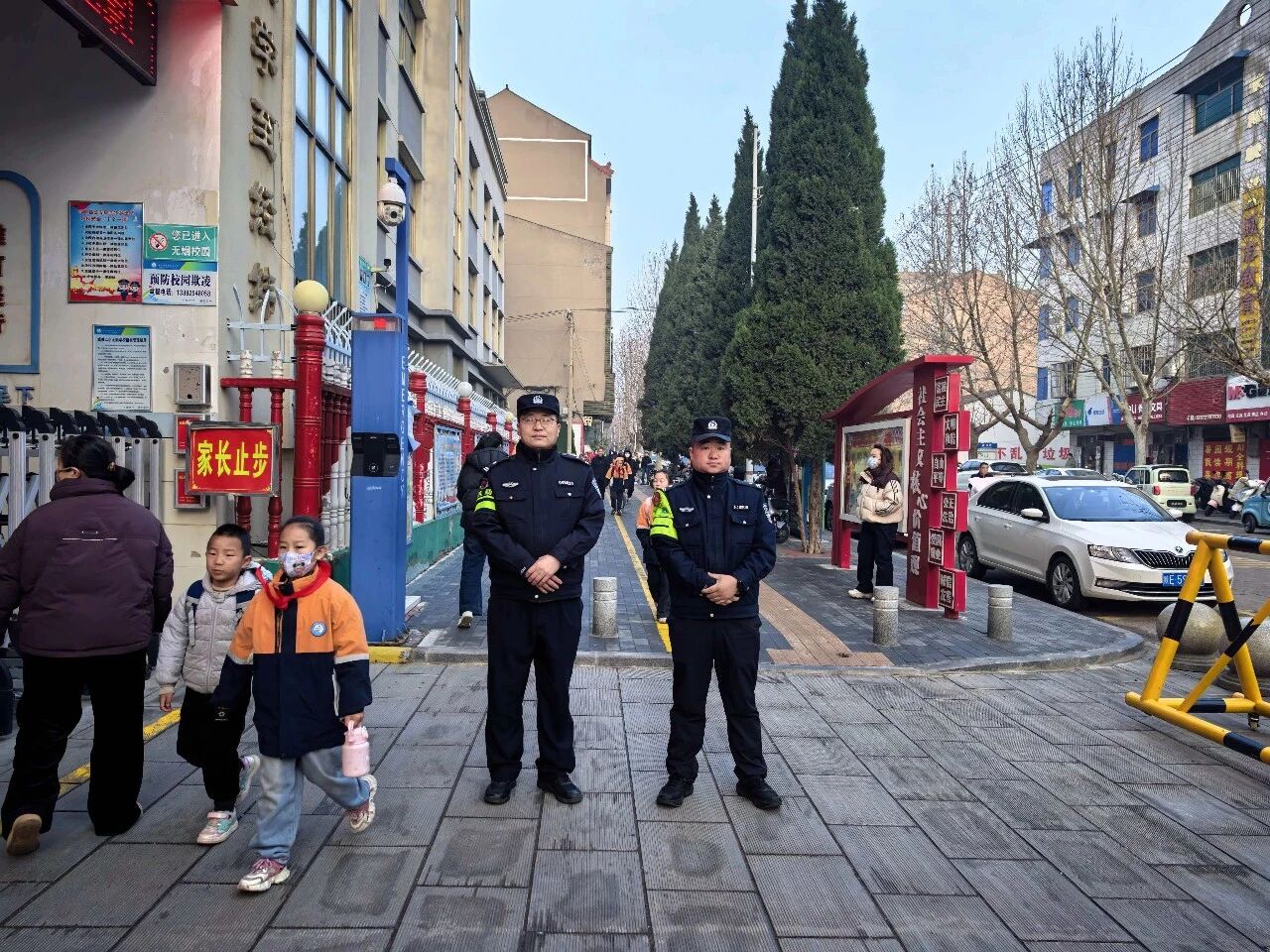 在辖区各学校门口及周边重点路段实行定人、定岗、定责勤务模式,确保上下学高峰时段“见警察、见警灯、见警车”。执勤民辅警提前到岗到位,引导学生安全有序入校,提醒接送家长即停即走,及时疏导交通、疏散人流,有效避免人员聚集拥堵。针对交通复杂的校门口路段,积极协助交管部门设置临时停车区域,规范车辆通行秩序,全力维护校园周边治安与道路交通安全。
